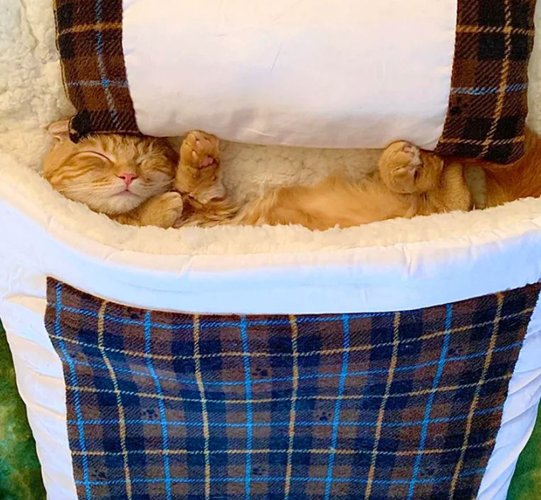Hinako-chan (@hinako_munchkin) is a ginger Munchkin in Japan that has taken a liking to a kitty-sized futon. Pctured in the photo is her brother, Tino.