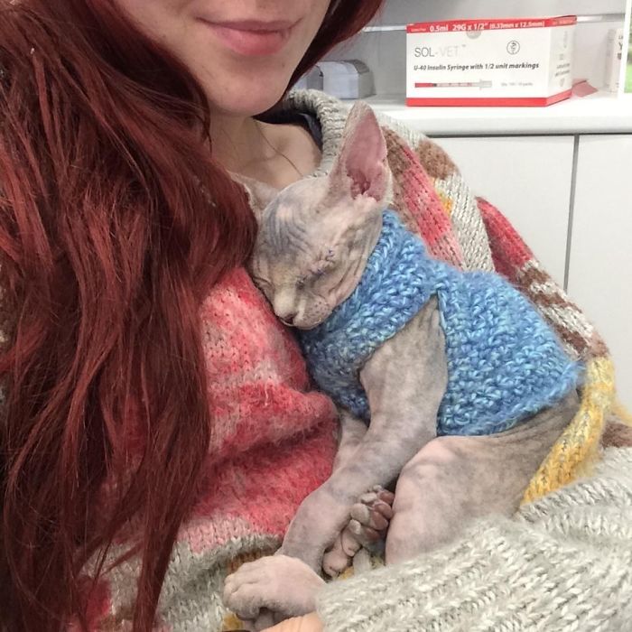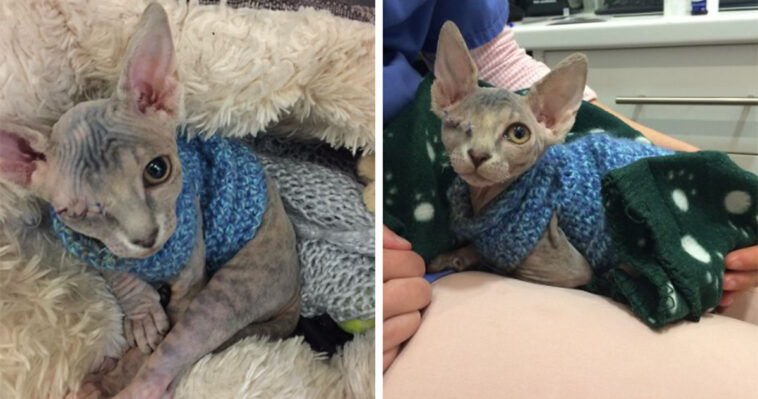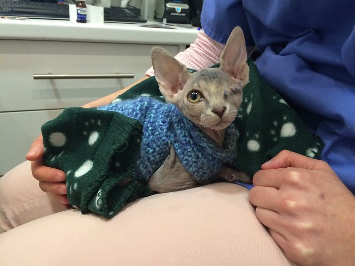 The moment 24-year-old Phoebe Gill saw a picture of Stitch the pretty cat, the one-eyed bald pretty cat, she knew she had to adopt her. “She had an injury to her eye, which would have been cured with medication but her breeder didn’t take her to a vet,” the rescuer writes.