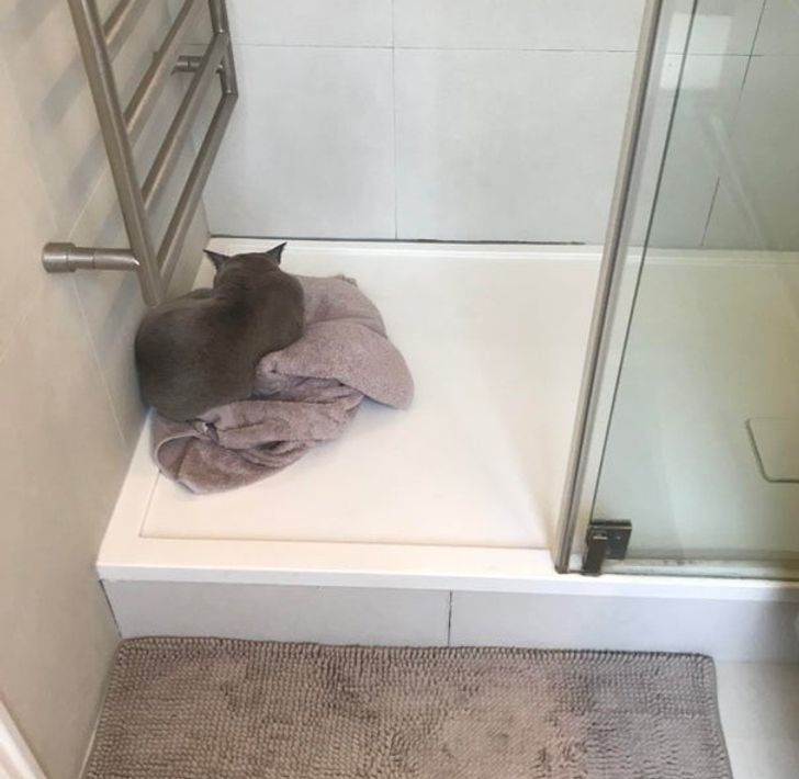 6. “My cat has figured out that if he pulls the towels down from the heated drying rack, he gets extra warmth.”