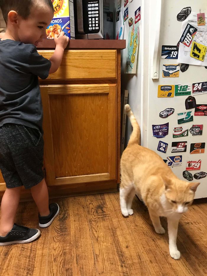 #2 My Kitchen, Not My Cat. My Older Cat Escorted Him In Through The Kitty Door And Walked Him Over To The Food Bowl!