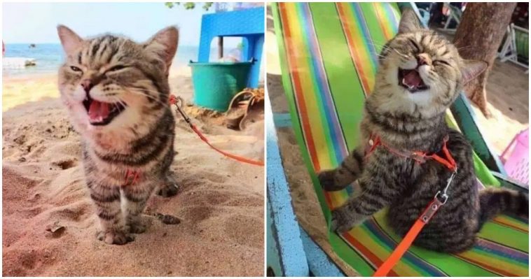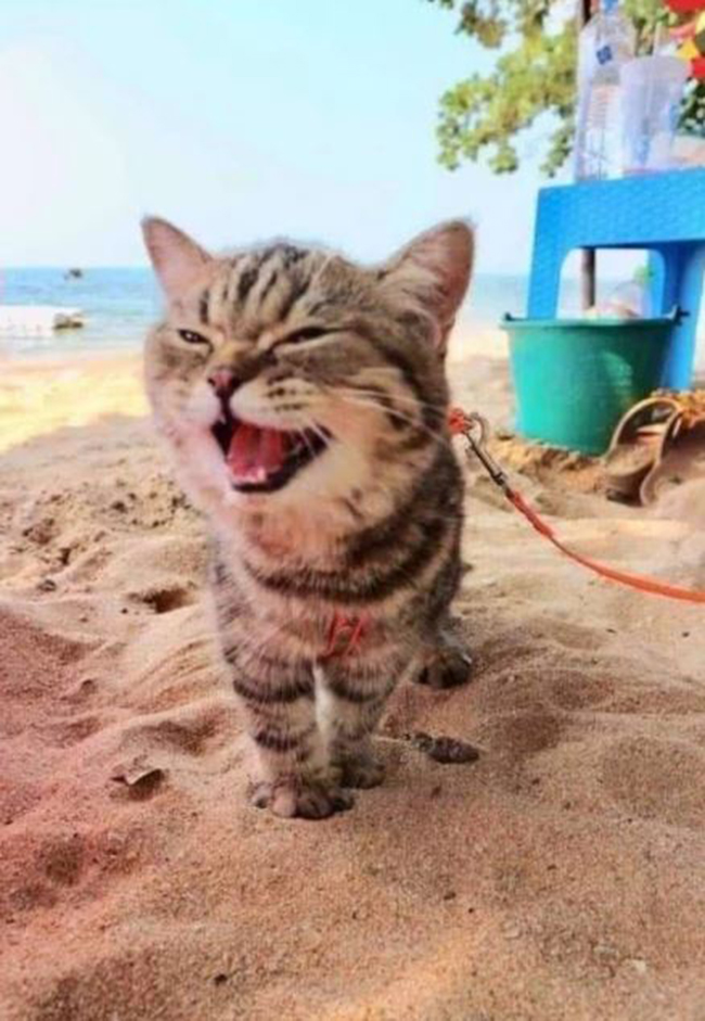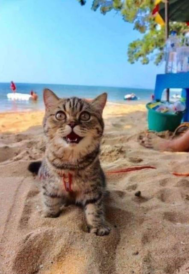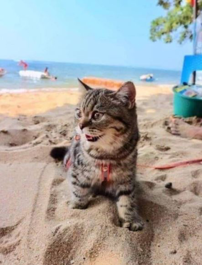 The excited little catto can initially be seen curiously surveying her surroundings with her paws digging into the sand. The adorable kitty then flashes a huge grin at the camera to share her joy at being able to experience the beach for the first time.