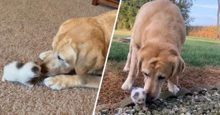 The gentle giant immediately took to the little feline and started caring for her. The kitten was drawn to the warmth and nuzzled into his fur for comfort. She stopped crying, curled up next to him, and went right to sleep.
