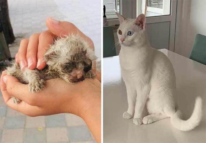 18. I found this kitten dumped in the middle of the road too weak and hungry to get to safety. The photo on the right is what is six days of cuddles by the fireplace, lots of food and a cosy bed can do