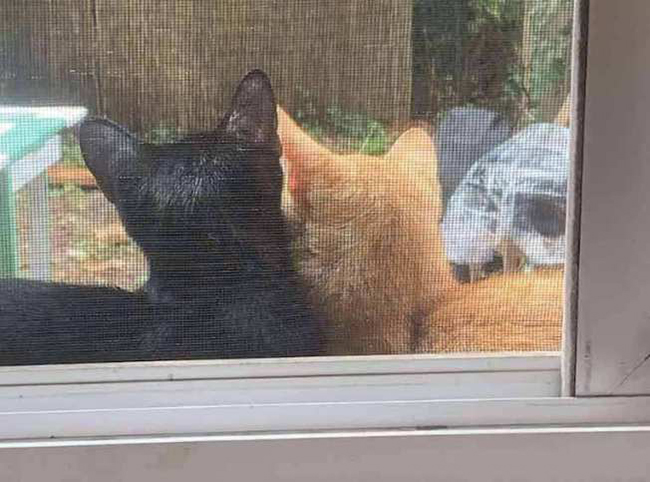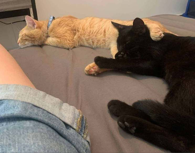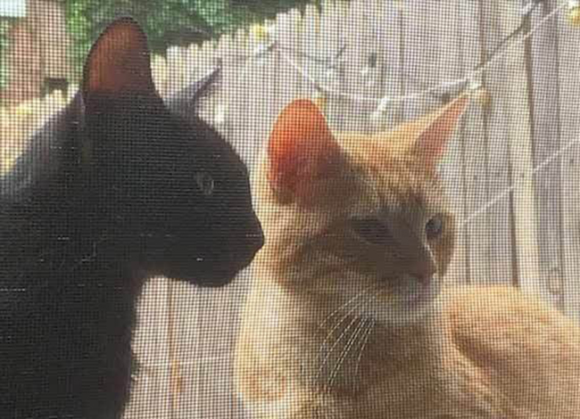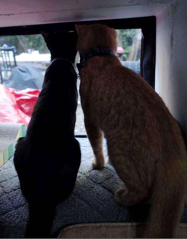 It was in fact two cats, a black one and orange one. They thought that they must be strays as both of them looked very hungry, so Rob put out some leftovers for them, a nice piece of salmon that had been sitting in the fridge. “They started to come back every single night after that,” said Gianna. “Meowing, waiting at the door and sleeping on the windowsill.”