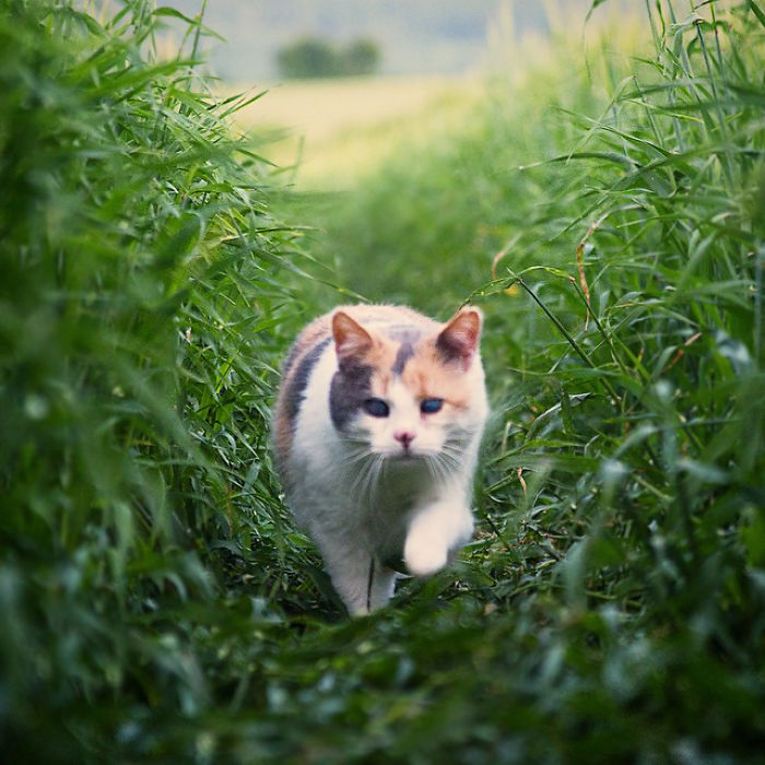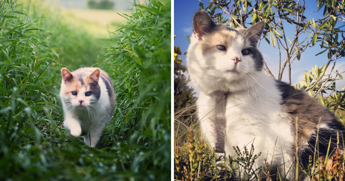 Stevie is a blind cat I adopted four years ago from a local animal shelter in Cork, Ireland. She’s a natural explorer and loves to accompany me on hiking trails in the beautiful Irish countryside and the surrounding mountains. When we go hiking together, my adorable cat usually prefers to explore all by herself and follows my sounds. She also walks alongside me on a leash or balances on my shoulders with ease!