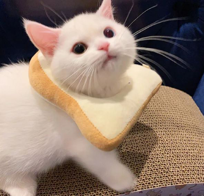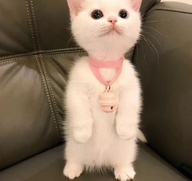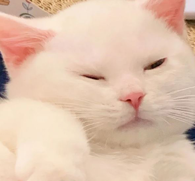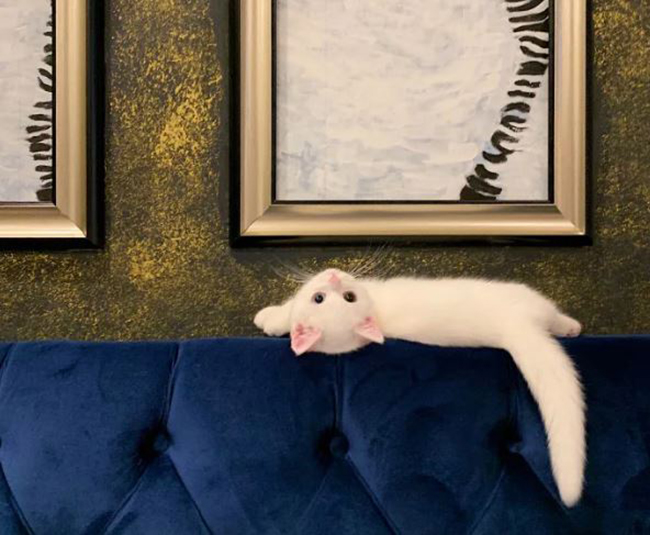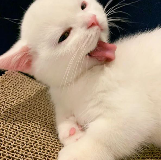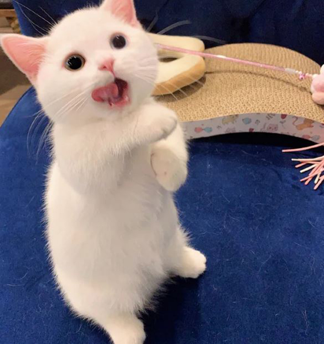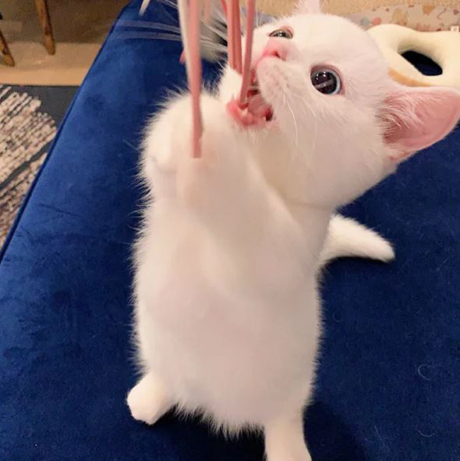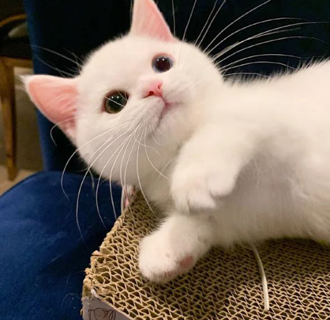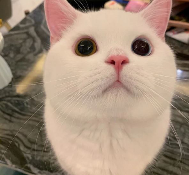 This cute, cuddly kitten’s name translates to egg baby, which is quite sweet. And he has a skin condition called heterochromia so, that probably explains why he has pink fur.