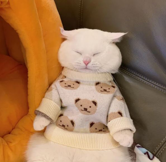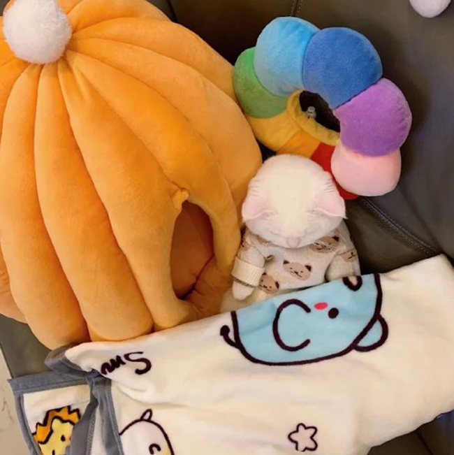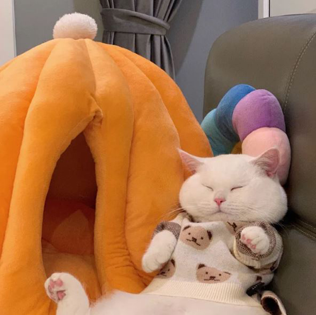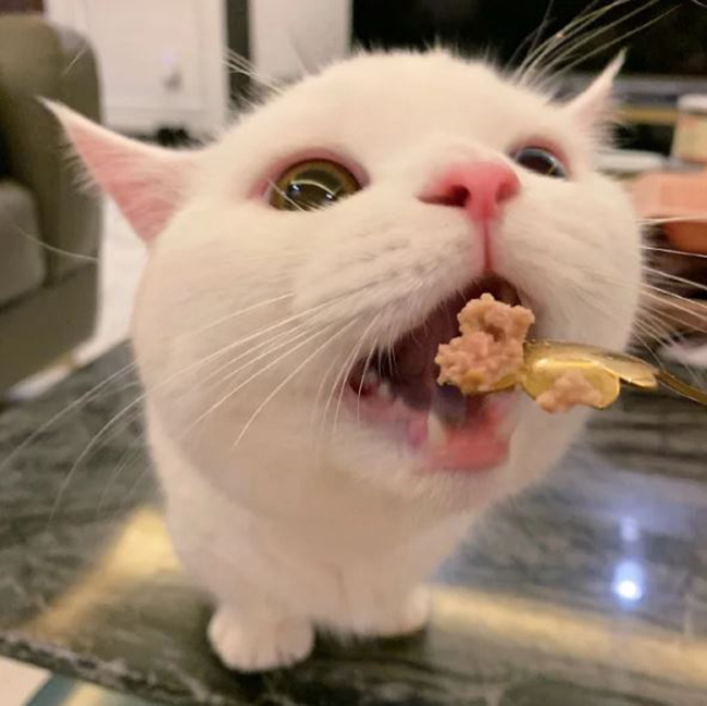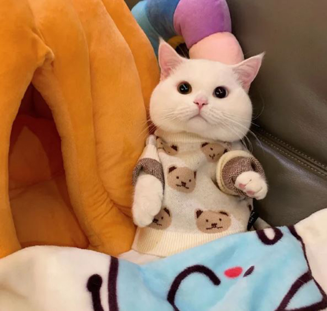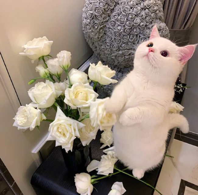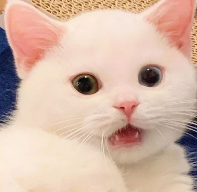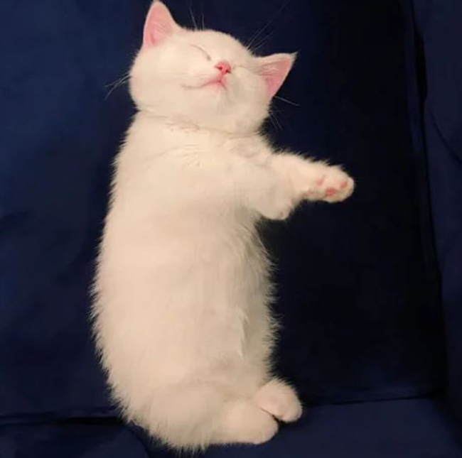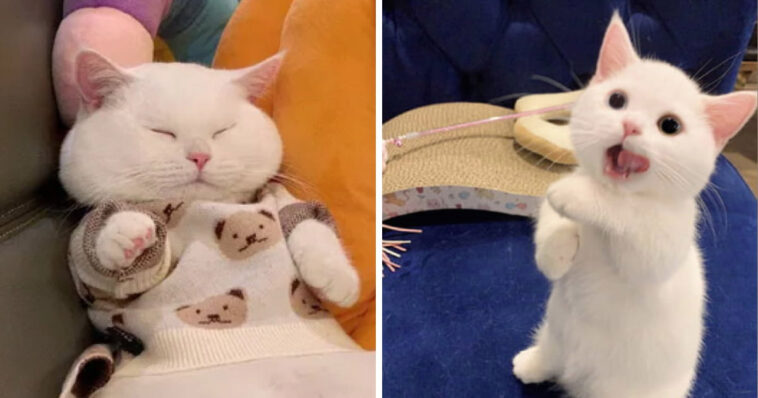 This cute, cuddly kitten’s name translates to egg baby, which is quite sweet. And he has a skin condition called heterochromia so, that probably explains why he has pink fur.