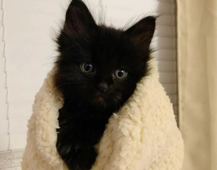 As soon as they uncovered the cardboard carrier, the kitten started meowing at the top of his lungs and crawled up to the side of the box, eagerly seeking affection.