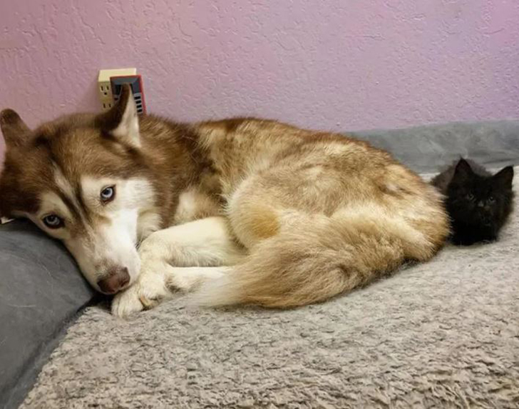 The fearless kitten snuggled right up to Finny the Husky and tried to mimic the sweet canine.