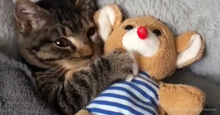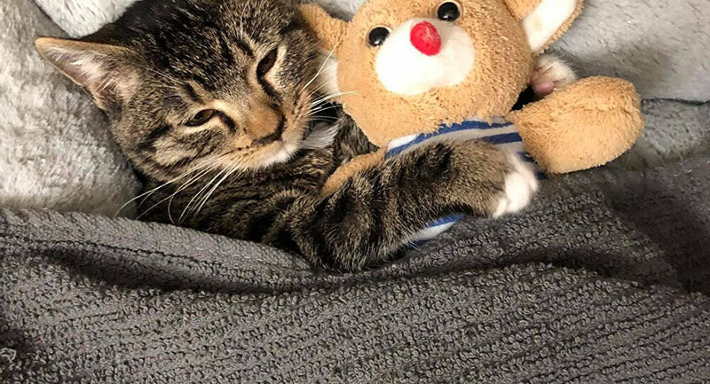 Apparently not only kids wish to have stuffed toys by their side, when sleeping, but animals as well. Casper a sweet kitten was rescued by Marielle Tepe when he was just a couple of weeks old. The woman have hand fed the little one and showered him with love.